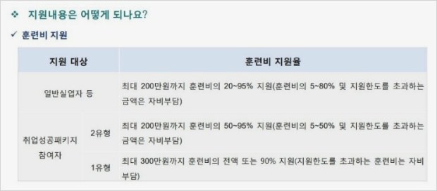 또한 지원 내용에 대하여도 바로 살펴보도록 할게요. 지원대상이 비교적 크게 취업성공패키지와 일반과정 둘로 나누어지시게 되는데요. 일반의 경우 훈련비의 20% 에서 95%내로 지원이 되어져요.