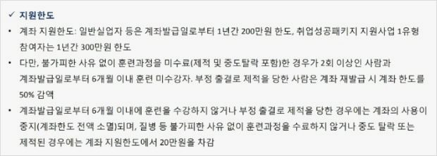 지원한도는 앞서 일시적으로 말 해드린것과같이 1년간 200만원이 지원이 되어지는데요. 취업성공패키지로 지원을 해보게 되는 경우에 1년간 300만원의 지원금이 제공이 되어지게 되는데요.