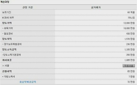 가장우선 아파트 양도소득세 계산을 하시려면 본인이매도하시게된 부동산에 관련 되어진 내용를아시고있으셔야겠죠!!?기본적으로는 취득일자, 매도일자, 또한 전용면적,보유주택수 정도를 입력하게되어지면 오토로양도소득세가 계산이 되어지게 되어나와요.